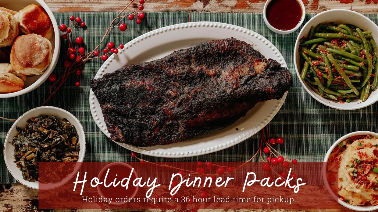 Make the holidays easier with a WRB Holiday Dinner Pack. Each one serves 10 and includes your choice of smoked turkey or brisket, gravy, cranberry relish, rolls, and two or three sides. À la carte sides and desserts are also available. Packs come cold with easy reheating instructions.
